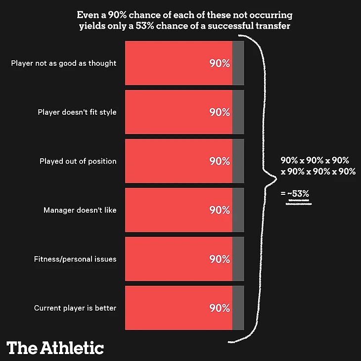 Грэм также показал с помощью некоторых базовых математических расчетов, насколько сложным может быть рекрутинг и удержание игроков. В упрощенном примере он объяснил, как трансферы распределяются примерно 50 на 50 между успешными и неудачными, даже если у вас есть 90% уверенность по группе категорий, как показано на диаграмме ниже.