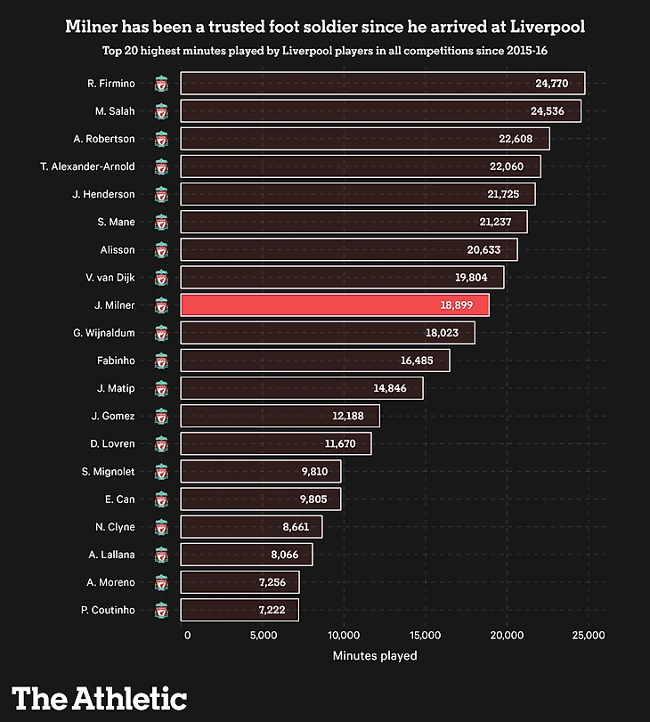 И как мы видим, Милнеру очень доверяют в эпоху Клоппа в целом. Он входит в десятку лучших игроков «Ливерпуля» по количеству сыгранных минут с 2015/16 годов, когда Клопп сменил Роджерса в октябре того сезона.