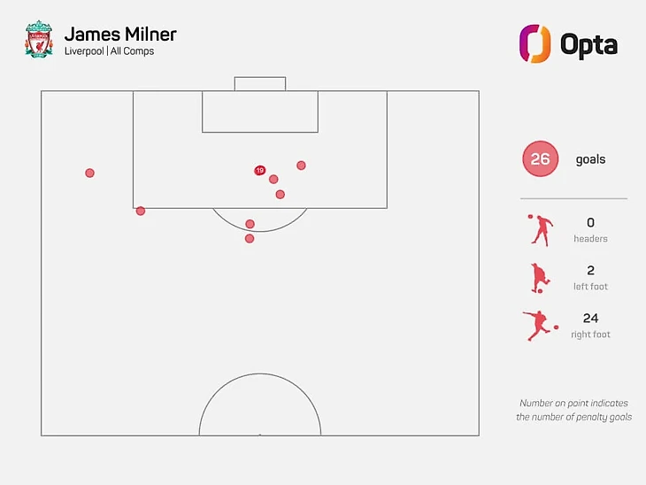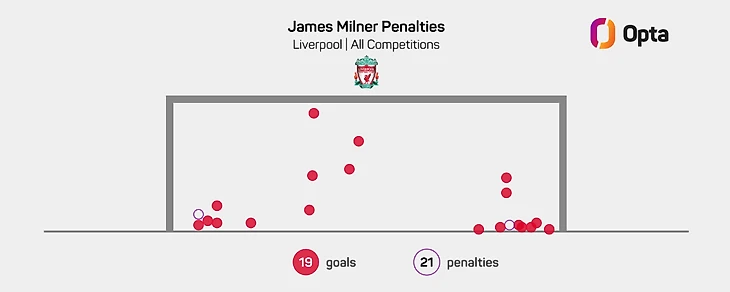 До того, как Мохамед Салах стал избранным пенальтистом «Ливерпуля», эту работу выполнял Милнер... и он ни разу не промахнулся мимо цели. Он забил 19 мячей и два было отбито, оба в 2017 году, причем большинство из них были нанесены в нижние углы ворот.