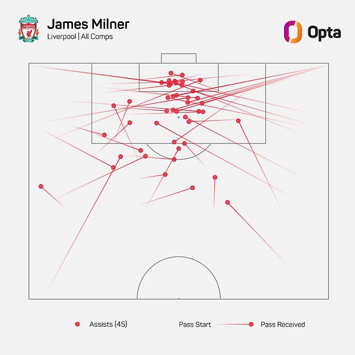 Что касается голевых передач в целом, то Милнер отдал за «Ливерпуль» 45 ассистов, причем 33 из них — с игры.
