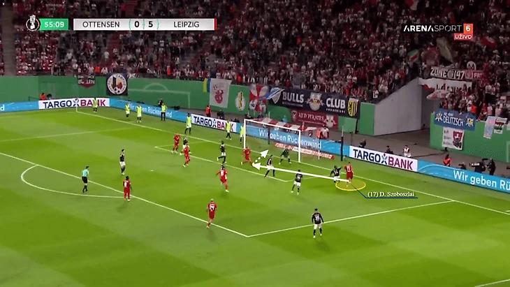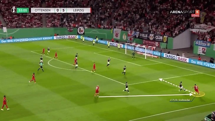 В этом примере против «Оттенсена» Собослаи подобрал мяч на правом фланге и проскочил мимо ближайшего защитника.