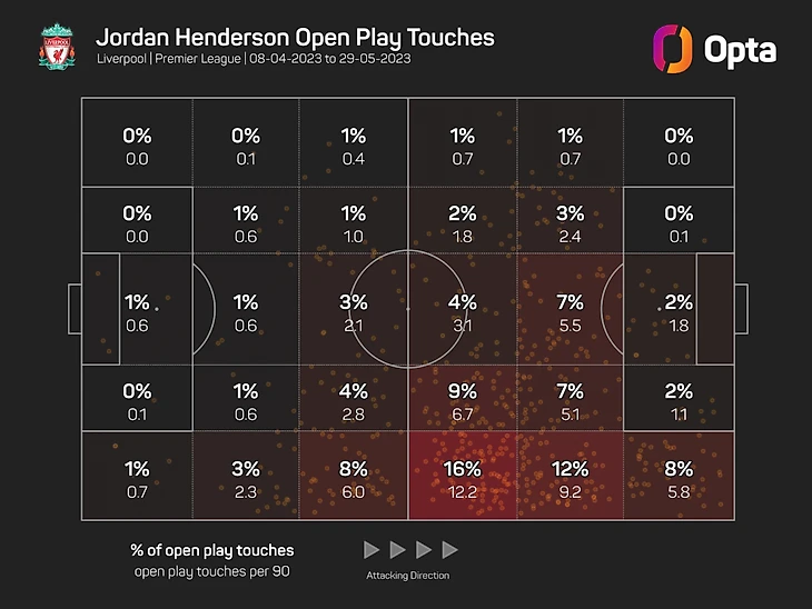 На приведенном ниже графике показана карта касаний Хендерсона в последних 10 играх прошлого сезона и показано, как часто 33-летний игрок дрейфовал во фланг, чтобы получить мяч.