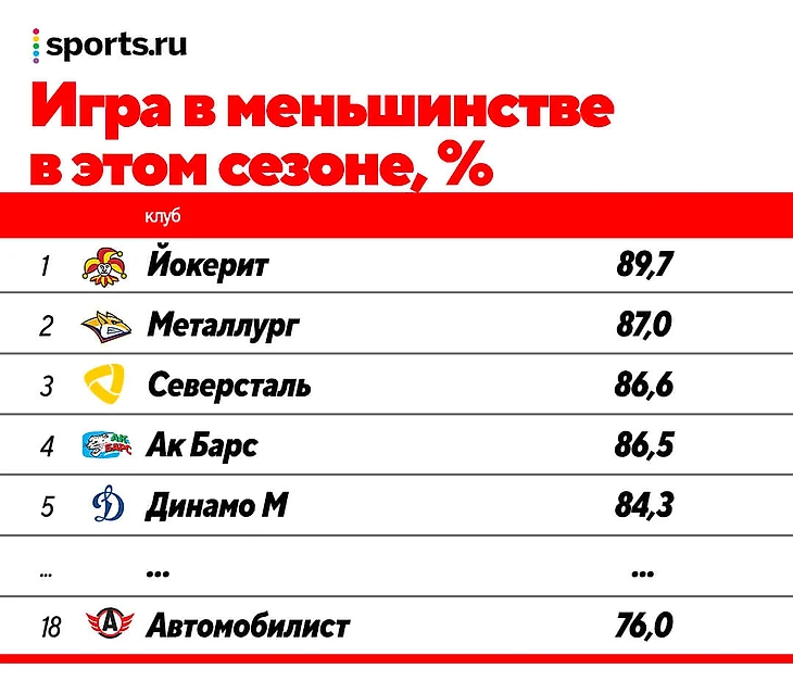 С такими проблемами в равных составах было бы странно ожидать идеальной работы при игре в меньшинстве. «Автомобилист» поднялся с последнего места, на котором находился в начале сезона, но пока результат все равно хуже даже прошлогоднего (16-е место, 78,2%).