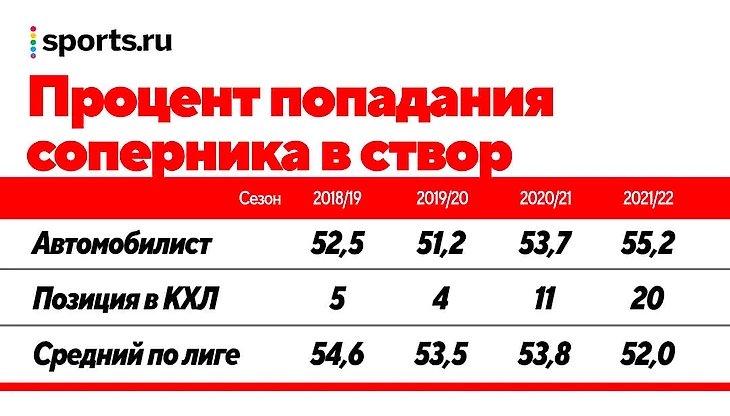 Екатеринбуржцы еще при Мартемьянове были в числе лидеров по этому показателю (сейчас его «Сибирь» допускает лишь 49,5% попаданий в створ – 6-е место). «Автомобилист» пошел вопреки тренду на плотную игру, и процент бросков в их створ вырос. Дело тут не только в блоках, не стоит сбрасывать со счетов броски мимо. Хорошо защищающаяся команда часто вынуждает мазать – не дает времени на подготовку и прицеливание, заставляет бросать из неудобных позиций. «Автомобилист» же систематически позволяет бить с убойных точек, такие моменты рано или поздно конвертируются в пропущенные голы.