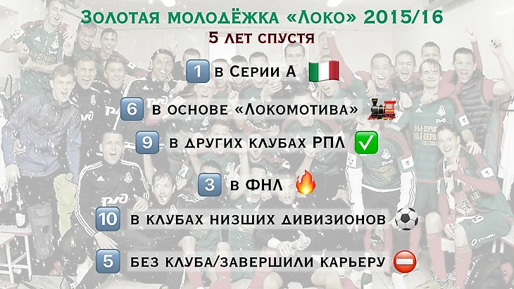 Немало игроков того состава пробились и в другие клубы РПЛ. Среди них, например, второй после Гильерме вратарь этого сезона по числу сухих матчей Илья Лантратов, игрок обоймы чемпиона страны Андрей Мостовой или полузащитники «Ротора» Сергей Макаров и Николай Кипиани. Совсем недавно «Локомотив» покинули Роман Тугарев и Георгий Махатадзе, перешедшие в «Ростов». Махатадзе, правда, успел за эти пять лет один раз уйти из клуба, вернуться в него, но заиграть только в «Казанке», и снова уйти. Александр Довбня, который был капитаном золотой молодежки, борется сейчас за место в центре защиты «Арсенала» с двумя другими воспитанниками «Локо» — Тарасом Бурлаком и Максимом Беляевым.