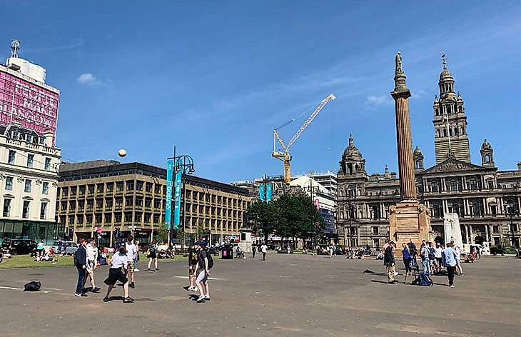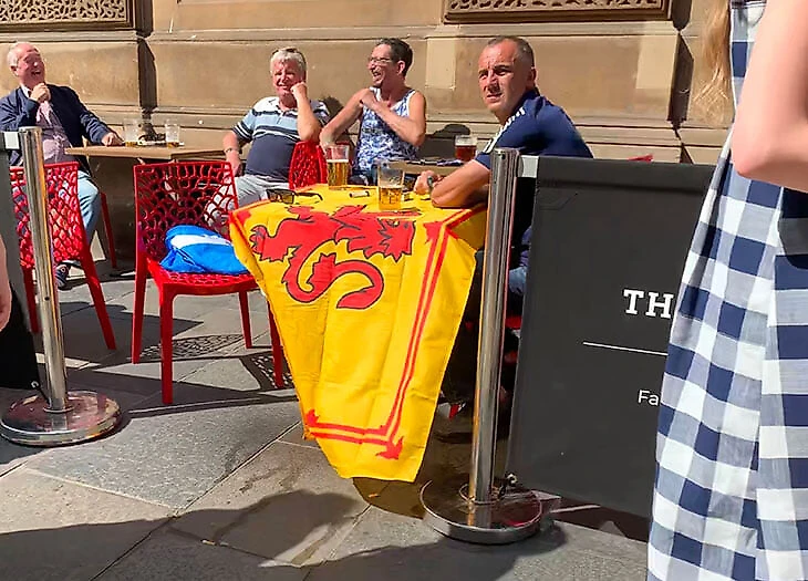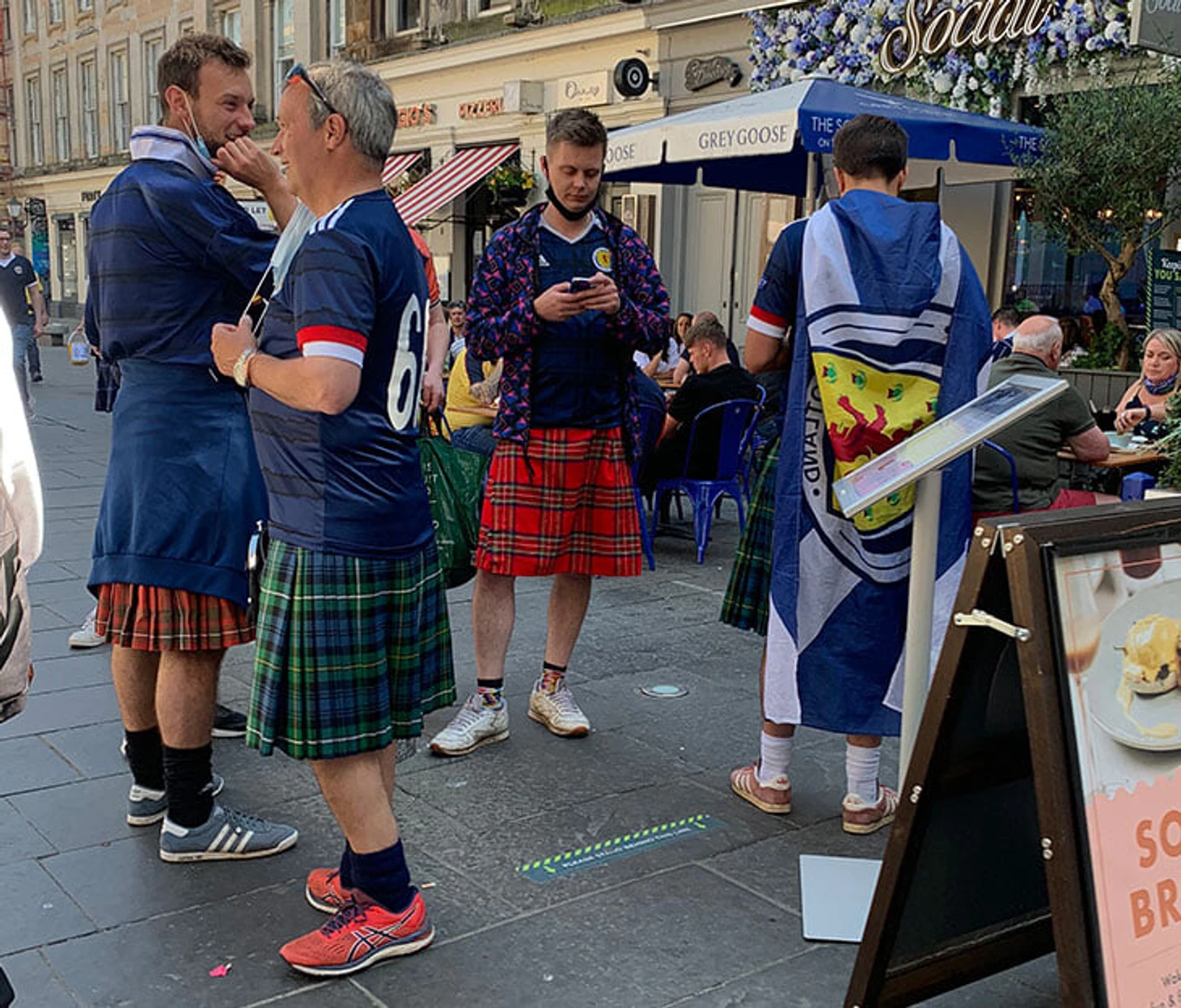 Улицы Глазго все так же захватили болельщики: казалось, что выходить во вторник без футболки сборной, килта или флага на плечах официально запрещено. Теплый день (солнечные +19) равномерно распределил шотландцев по всем пабам, уличным верандам и просто паркам с газонами.