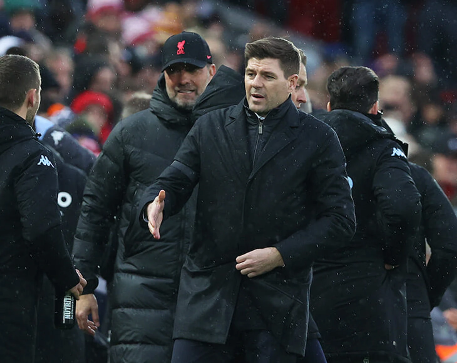 Джеррард появился на поле только перед стартовым свистком: еще в начале сезона тренеры давали предматчевые интервью на кромке поля, но теперь их перенесли в подтрибунку. Выход Стивена совпал с выходом «Ливерпуля» на поле, так что ремарки про «стоячую овацию» не совсем правдивы: с трибуны казалось, что хлопают скорее своим игрокам. Стивен же крепко обнялся с Клоппом и махнул рукой болельщикам «Виллы», поющим его имя.