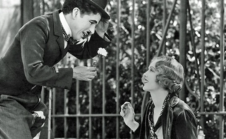 Фильм 1931 года "Огни большого города" тоже стал новаторским,- первой романтической комедией. Бродяга влюбляется в бедную слепую цветочницу и на последние деньги покупает у неё цветок. Она благодарит его и пожимает ему руку. Далее следует множество приключений, но в итоге Бродяга находит средства на операцию для девушки. Девушке возвращается зрение, она открывает цветочную лавку и становится богатой. Но она не знает, кто ей помог.