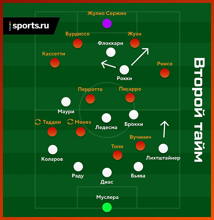 Вместо Тотти вышел Таддеи, который перекрыл правый фланг, а Менез заменил Де Росси. Француз помогал Писарро и Перротте в центре, но играл намного выше вице-капитана и связывал полузащиту с атакой. Вучинича Раньери попросил играть пошире.