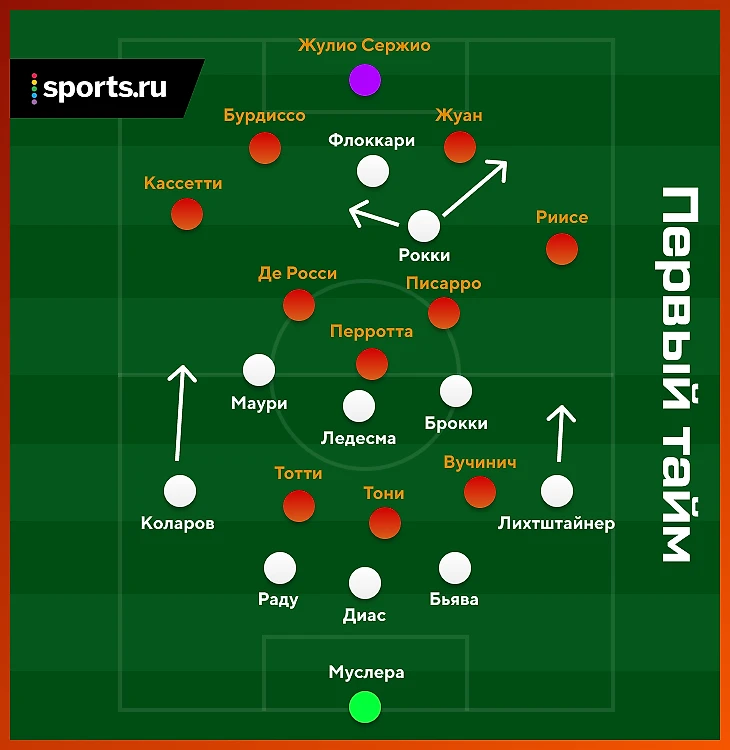 Клаудио выбрал на дерби схему 4-3-3 с мощной тройкой в центре (Де Росси – Писарро – Перротта) и Лукой Тони в центре нападения. Тотти и Вучинич номинально располагались на флангах, но постоянно смещались в центр.
