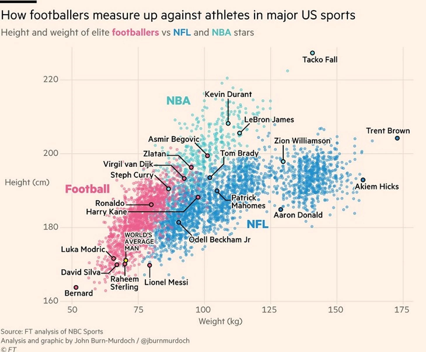 Сравнение габаритов звезд АПЛ, НБА, НФЛ и обычного человека: график, от которого сложно оторваться