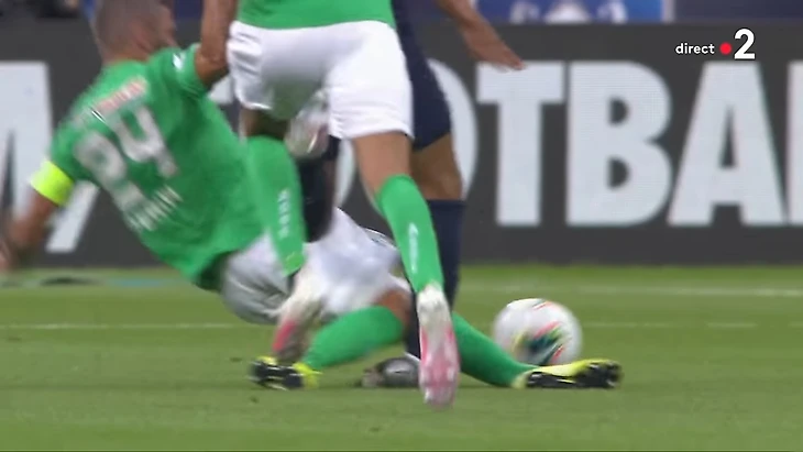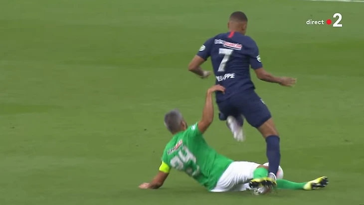 • На 29-й минуте случилось, пожалуй, главное: Лоик Перрен снес убегающего Килиана Мбаппе. С одной стороны, судя по повтору, 34-летний капитан «Сент-Этьена» коснулся мяча раньше ног нападающего, но фол все равно выглядел жутковато, особенно когда у Мбаппе изгибается правый голеностоп. Перрен сразу получил желтую.
