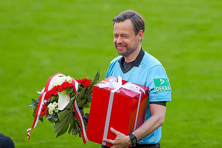 Главный арбитр матча «Бавария» – «Аугсбург» Маркус Шмидт тоже закончил. Но тут обошлись скромнее: что-то подарили и вручили цветы.