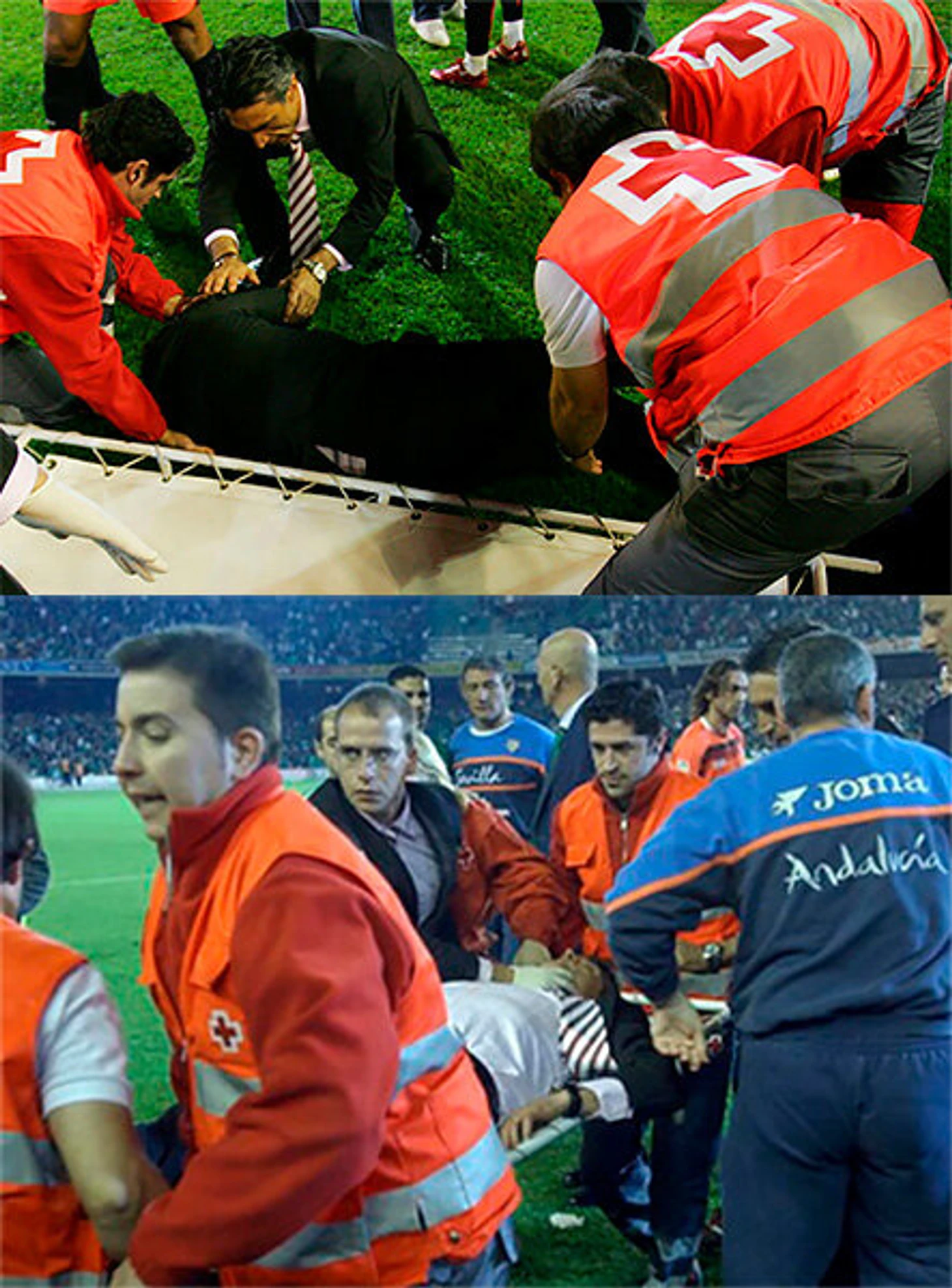 Тут же вспоминается, как в 2007-м по голове бутылкой прилетело тренеру «Севильи» Хуанде Рамосу. Он тогда вообще потерял сознание, его увозили с поля на носилках.