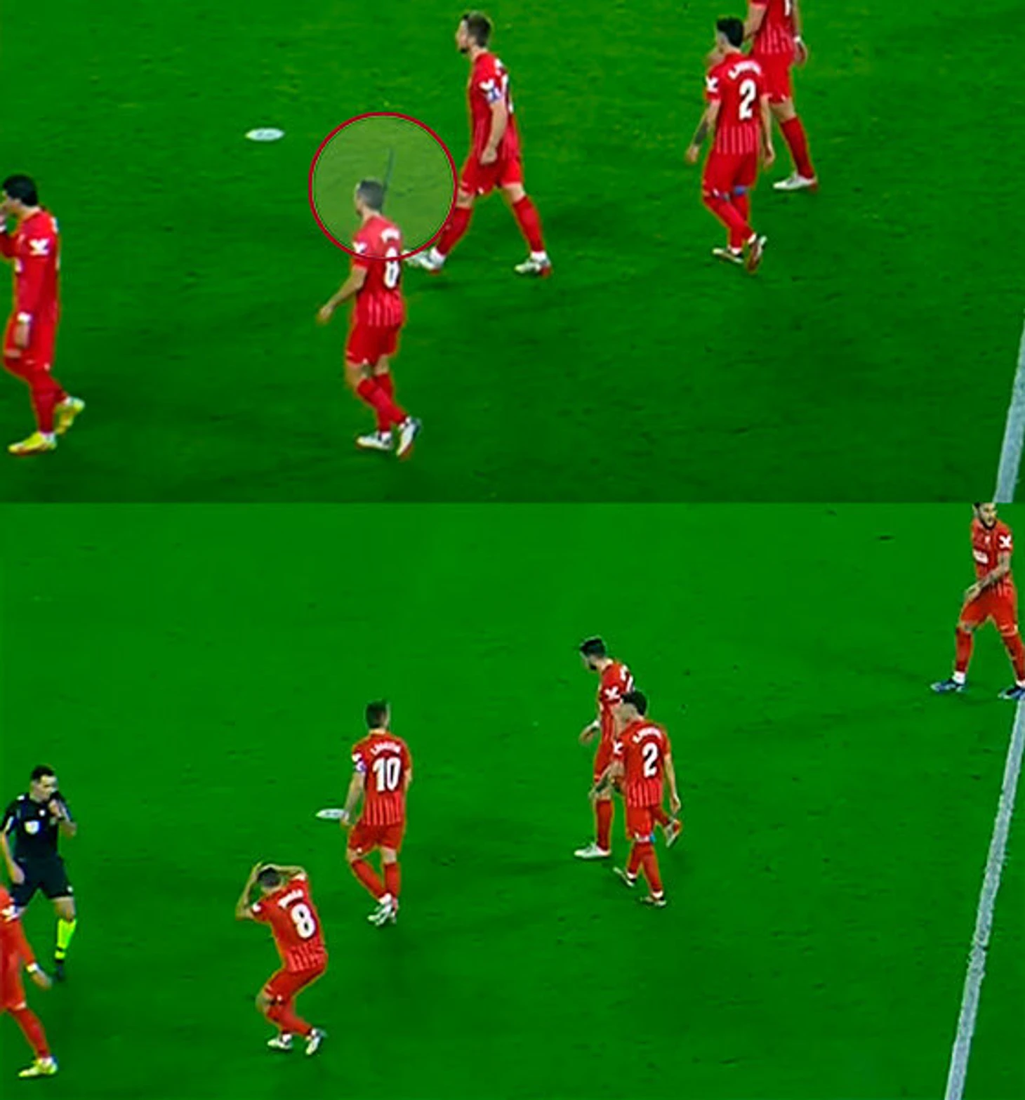 Она прилетела с трибуны в полузащитника «Севильи» Жоана Жордана, пока «Бетис» праздновал свой мяч. Игроки гостей в этот момент отходили от своих ворот, все были спиной к трибуне. Совсем рядом с Жорданом находился судья, было близко и к попаданию в него, он одним из первых увидел, что случилось, тут же подобрал с газона главную улику.