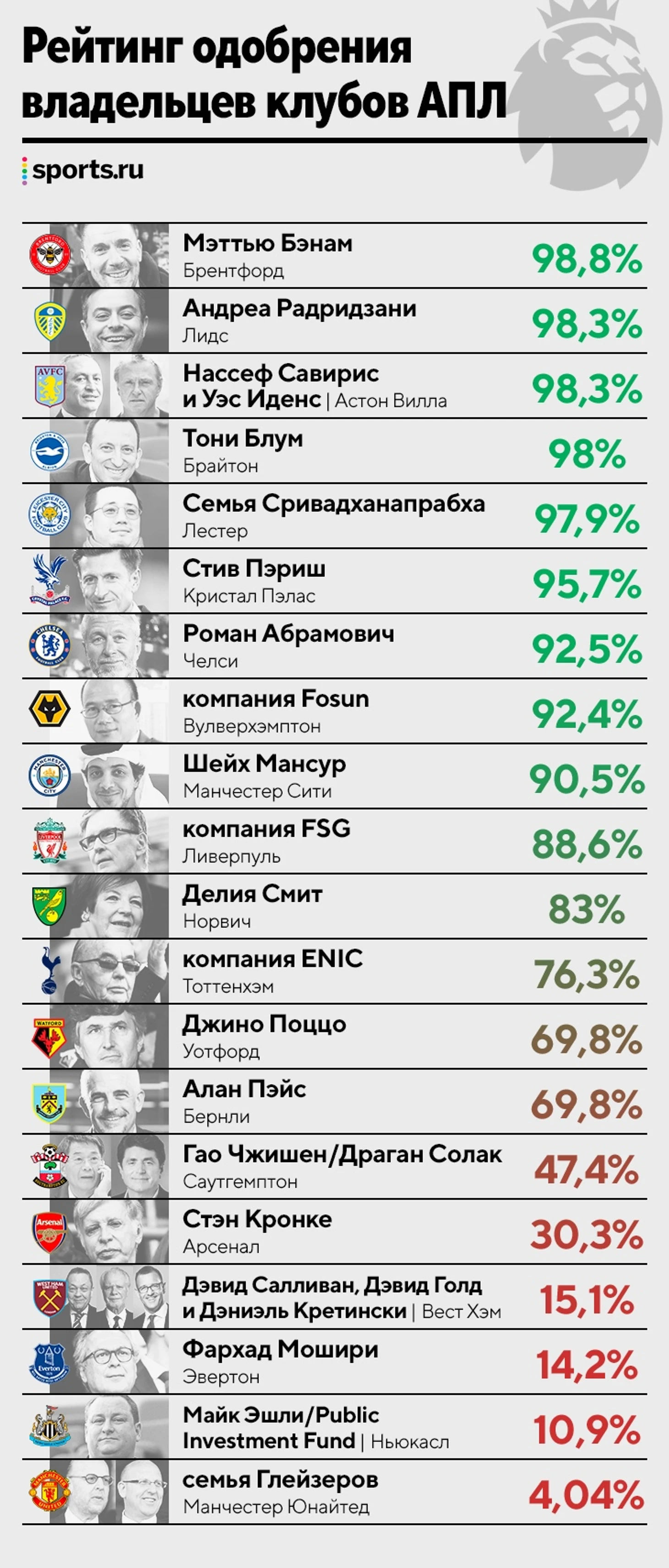 Британское издание Daily Mail провело исследование: как болельщики клубов АПЛ относятся к владельцам их любимы команд. Всего один вопрос: нравится или нет?