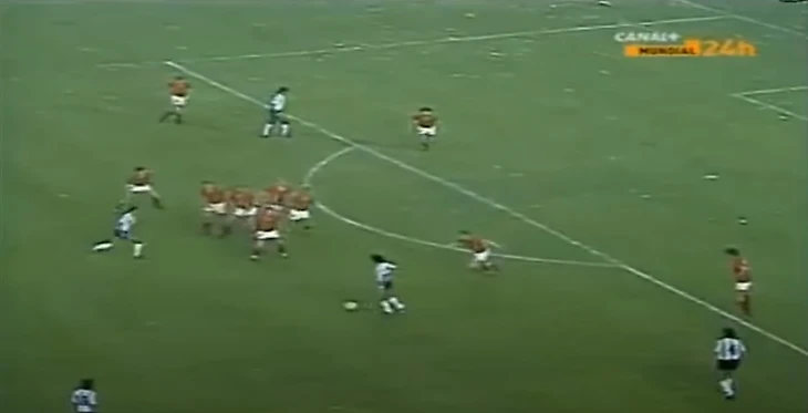Сборная Аргентины разыграла штрафной удар, а Диего находился рядом со стенкой. Игроки рассыпались по полю, но удачно попали в кадр Стива Пауэлла. Это фото сделало его известным.