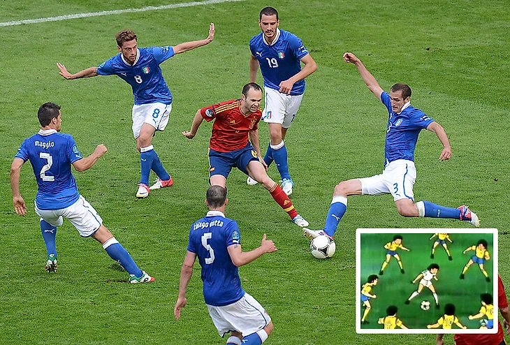 Иньеста много раз оказывался в одиночку против нескольких соперников. Эффектнее всего это выглядело на Евро-2012