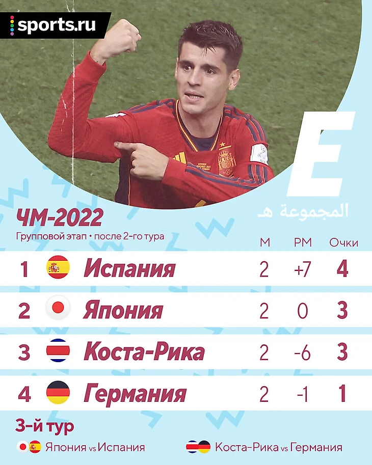 🇪🇸 Испания – лидер группы, почти наверняка выйдет в плей-офф. Для этого нужно не проиграть Японии – и тогда испанцы будут или первыми, или вторыми в зависимости от результата параллельного матча.