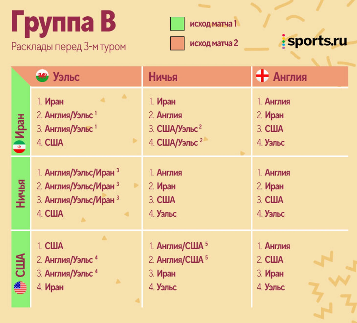2 (победа Ирана и ничья в матче Уэльс – Англия). Для третьего места США нельзя проигрывать с разницей в два гола и более. В этом случае третье место будет за командой, которая проведет более результативный матч в последнем туре.