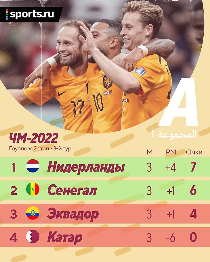 Теперь Нидерланды и Сенегал ждут соперников по плей-офф. Группа А выходит на группу B с Англией, Ираном, США и Уэльсом. Нидерланды получат команду со второго места, Сенегал – победителя группы. Все станет известно уже после вечерних матчей.