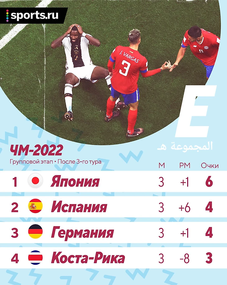 Сумасшедшая развязка в группе E: Япония обыграла Испанию (2:1) и вышла с первого места, а Германия хоть и прибила Коста-Рику (4:2), но закончила третьей.