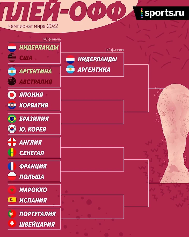 Игру Нидерланды – Аргентина увидим 9 декабря (пятница) в 22:00 на стадионе «Лусаил», где потом пройдет и полуфинал с участием победителя этой пары, и финал.