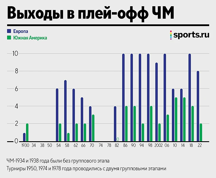 Также на графике вы можете отметить успешность команд на групповом этапе. Неудачными для Европы получились лишь ЧМ-2010 и ЧМ-2014 – всего 6 команд из 13 добрались до плей-офф. Успешным был отрезок с 1986-го по 2006-й, когда в плей-офф выходили по 10 команд (лишь раз – 9). В Катаре Европа отклонилась от привычного плана – всего 8 команд вышли из группы.