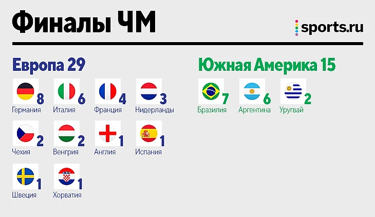 Теперь взглянем на статистику выходов в финалы. Тут доминирование Европы – 29 финалистов против 15. Превосходство европейцев началось с 1950-го – именно тогда последний раз в финале играли две южноамериканские команды.