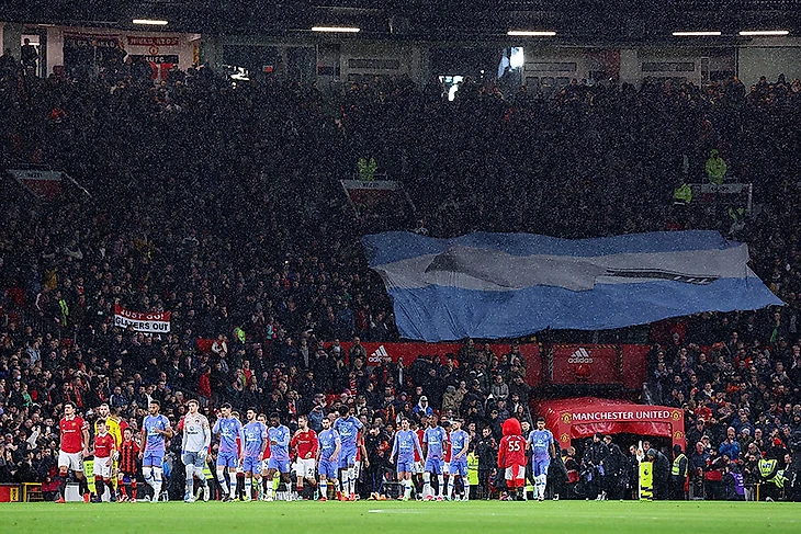Болельщики «МЮ» устроили Мартинесу теплый прием. На стадионе висел гигантский флаг Аргентины с тесаком – отсылка к прозвищу «мясник».