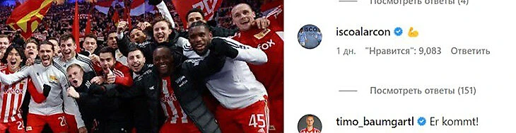 В комментарии ворвались не только игроки «Униона» с шутками (или не шутками) в духе «Он едет», но и сам Иско – ответил одним эмодзи. И это без его отметки в посте – то есть испанец явно в курсе интереса берлинцев.