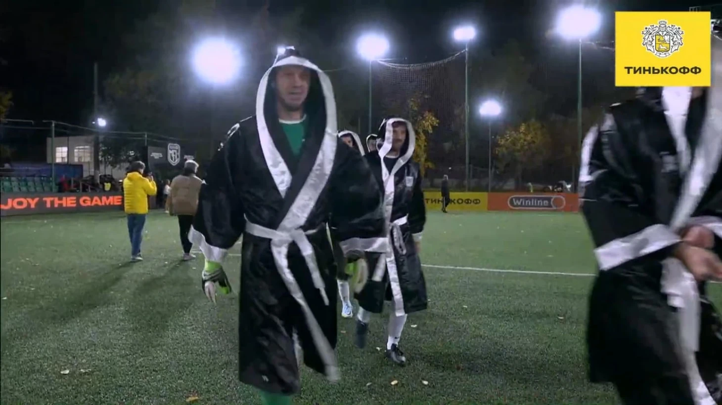 А во-вторых, команда легенд российского футбола вышла на матч в боксерских халатах. Футболисты явно настроились на матч с бойцами.