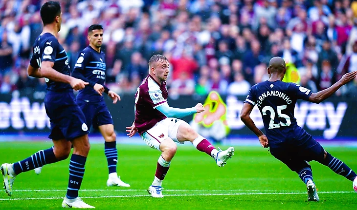 1-0, напряжение возрастает, дождь лишь усиливается. Вэст хэм всем составом на парковке в своей половине. Сити пытается вскрыть забор, но ничего не получается. Жезус в центре - навесы и забросы не в кассу; Грилиш и Кансело перепахивают фланги, а ударов нет. И вот под самый конец первого тайма Боуэн удваивает преимущество Вэст Хэма практически по той же схеме, только ассист от Антонио. Статистика не в пользу команды Пепа - Манчестер Сити никогда не выигрывал матч, проигрывая первый в 2 мяча. Лишь одна ничья, остальные поражения.