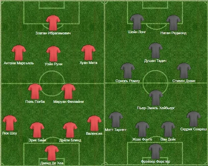Примерно с 15 минуты первого тайма «святые» начали систематически вести атаки через левый фланг «МЮ». Связано это было с тем, что Марсьяль и Погба не слишком помогали Шоу на фланге, да и сам Люк в нескольких эпизодах сыграл не лучшим образом. Никто из игроков атаки «МЮ» не встречал правого защитника Седрика Соареша, поэтому Шоу иногда сам выдвигался на португальца, тем самым обнажая фланг.
