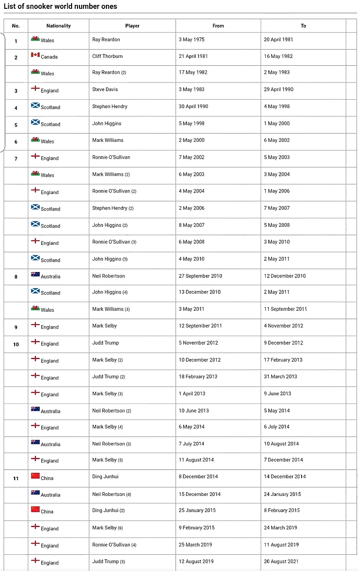 Марк Селби впервые стал первым номером мире десять лет назад, а также удерживал эту позицию с 2015 по 2019 год. У 38-летнего игрока было больше личных выступлений в качестве номер один в мире, чем у любого другого игрока с тех пор, как в 70-х годах была введена рейтинговая система.