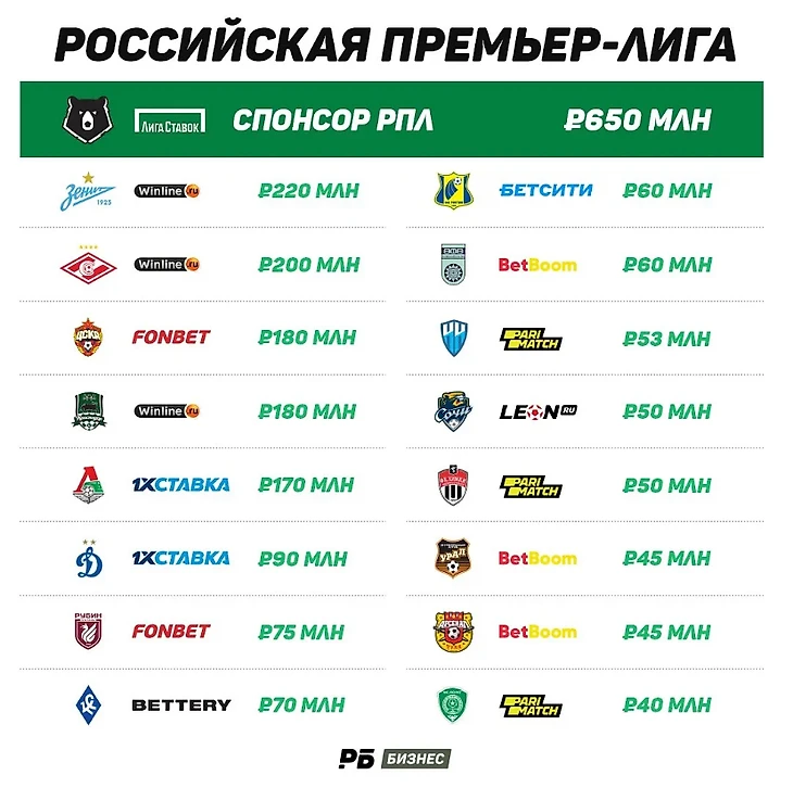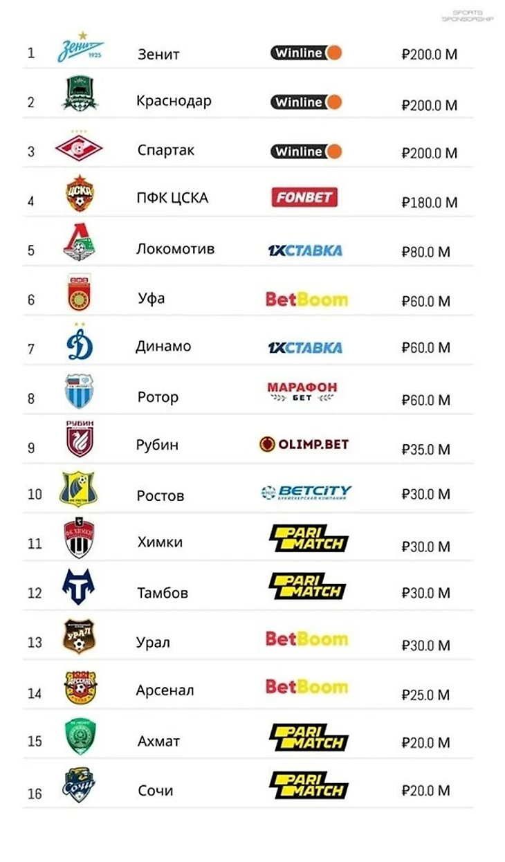 Букмекеры стали спасителями отечественного футбола в последние годы - благодаря многомиллионным контрактам с РФС, РПЛ и многими профессиональными клубами. В сезоне 2020-21 соглашения букмекеров с 16 клубами РПЛ выглядели так: