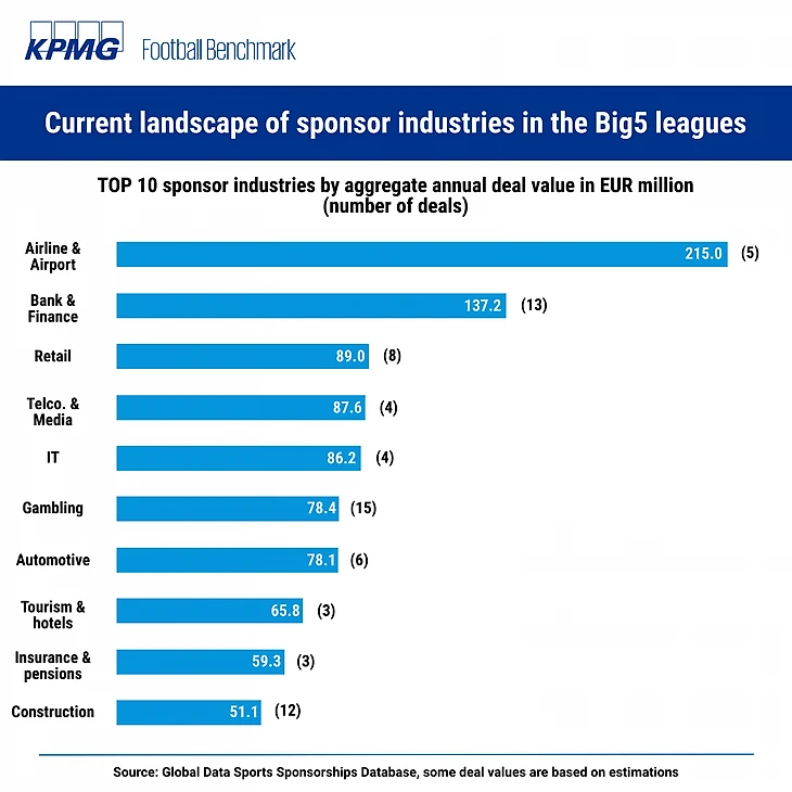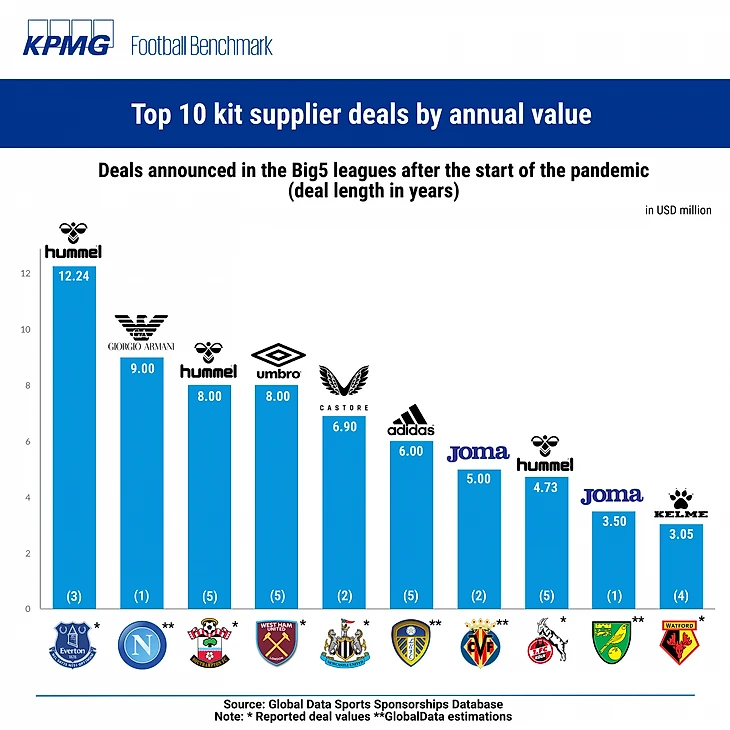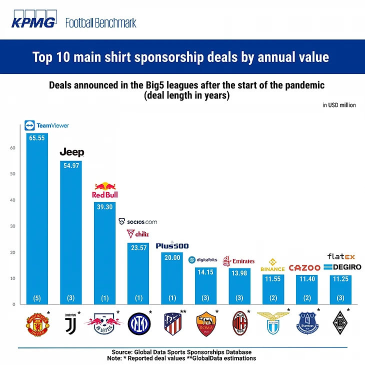 Анализ KPMG охватывает клубы из топ-5 лиг, которые объявили по крайней мере об одной новой сделке со спонсорами на футболках или поставщиками экипировки, начиная с мая 2020 года. Данные получены из базы данных спортивного спонсорства коммерческого поставщика данных KPMG - GlobalData. Стоимость и сроки сделок, используемые для анализа, являются либо реальными значениями, сообщенными надежными источниками, либо оценками GlobalData.