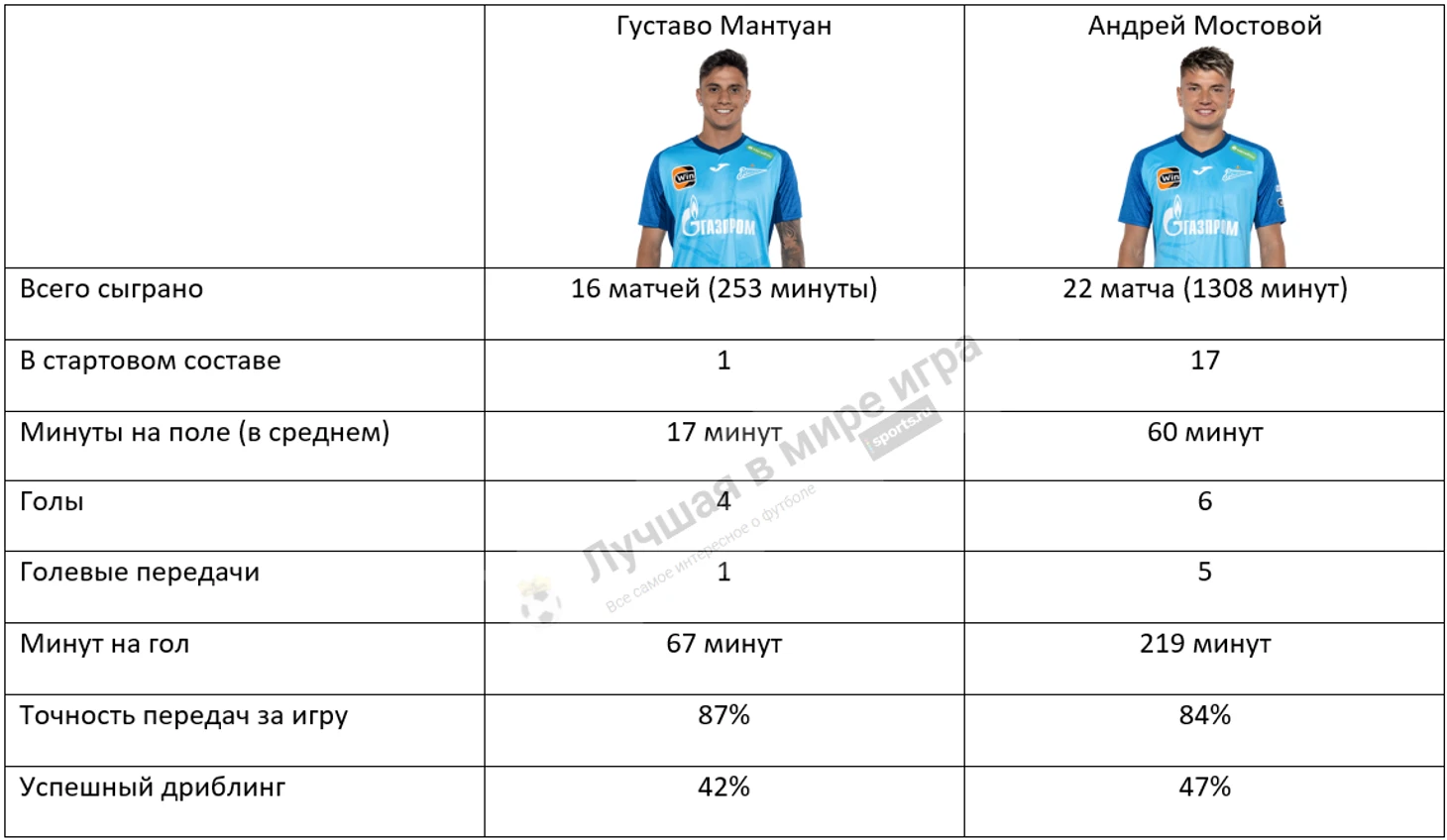 Главным конкурентом Густаво Мантуана за место в составе является Андрей Мостовой. По многим показателям россиянин превосходит своего партнёра по команде. В Российской Премьер-лиге статистика футболистов выглядит следующим образом: