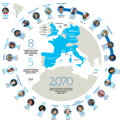 На этой неделе игроки «Челси» начали возвращаться из сборных, со всего мира. Однако для невероятного количества (26) из них пунктом назначения не будет ультрасовременная тренировочная база в Саррей, они отправятся в целый ряд клубов в Англии, Европе, и даже — как в случае с крайним защитником Кристианом Куэвасом — в Чили. Многие из них ни разу не надевали синюю форму главной команды, а многие никогда и не наденут.