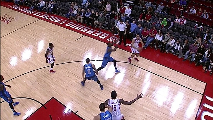 Установивший буквально на днях личный рекорд по количеству трехочковых - восемь за матч - Гордон, был близок как минимум к повторению этого результата, но остановился на "скромных" шести. Робкие попытки "Мэвс" хоть что-то изменить в начале третьей четверти, тремя дальними бомбами подряд пресек Тревор Ариза. Но венцом снайперского пиршества хозяев в отчетной игре стало трехочковое попадание... (знал, что когда-нибудь настанет день произнести это имя) Монтр... Монрезла, или Монреза Хэррела, как его вроде величают местные комментаторы, проглатывая последнюю букву, - в общем, попадание кого-то из них. Причем трехочковый Хэррела сопровождался не только сиреной об окончании владения, но и невероятным отклонением самого игрока, выпустившего мяч по высоченной траектории в миллиметрах от блока, отлично защищавшегося в этом эпизоде Дуайта Пауэлла. После пропуска такого удара, руки опустятся и у самых стойких бойцов. По иронии судьбы ни к одному из 19 дальних попаданий "Рокетс" не оказался причастен Райан Андерсон - снайпер, кормящая точка которого, такое ощущение, отдаляется с каждым матчем все дальше и дальше к середине площадки. К стандартным броскам Райана с 10-12 метров уже настолько привыкли даже судьи, что в одном из эпизодов, когда форвард забрасывал, на первый взгляд, очевидные три очка, они засчитали двухочковый. Мол, слишком близкая "трешка" - по меркам-то Андерсона. Хотя, может быть все дело в маскирующих заступ белых подошвах кроссовок Райна, на которые судьи банально не купились.
