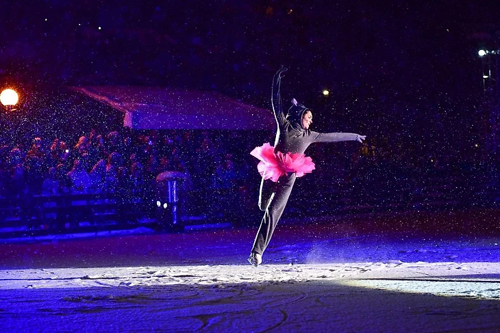 В этом году Евгения Медведева решила порадовать зрителей предновогодним сюрпризом - фигуристка перевоплотилась в сказочную Мышку, которая становится балериной и показывает фрагмент балета «Щелкунчик». Настоящая сказка на льду смотрится особенно волшебно в новогодней атмосфере. И будто по задумке постановщика природа дополнила картинку сказочным снегопадом.