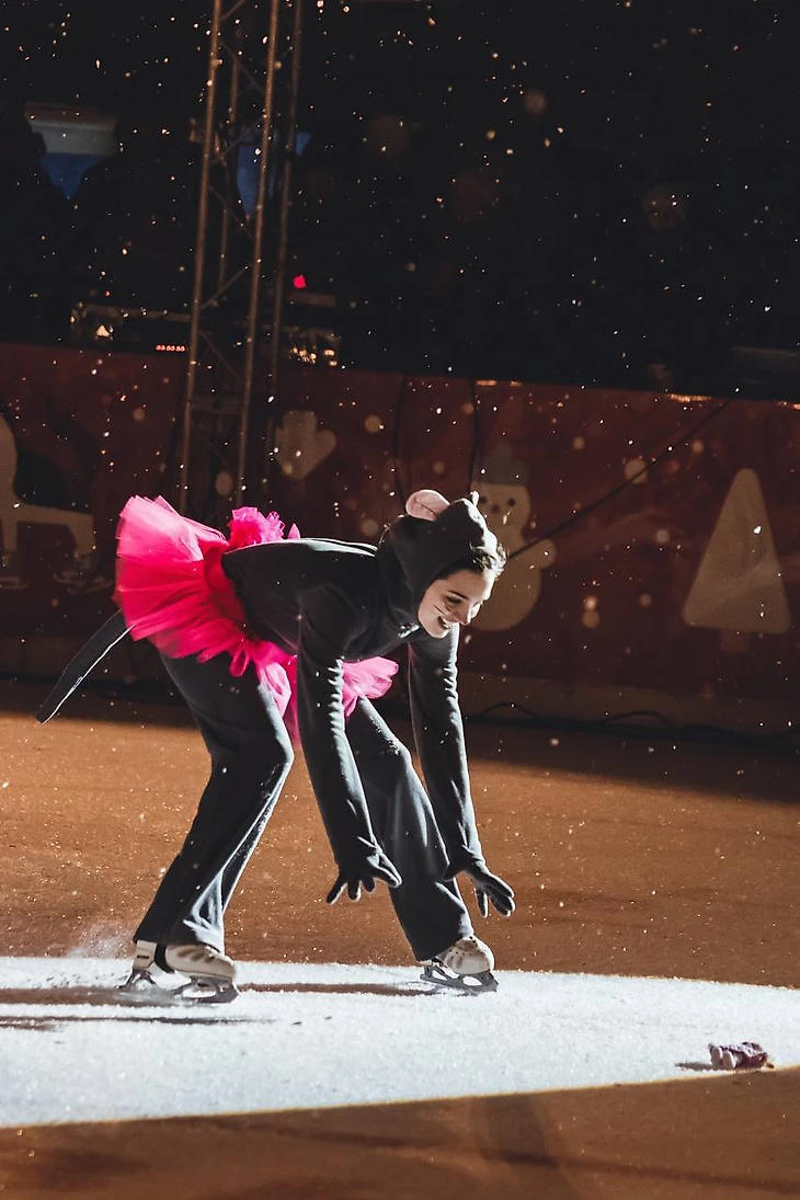 Номер вышел совершенно чудесным - Евгения появляется на льду внезапно, перепрыгивая через бортик катка. Под танец Феи Драже Мышка осматривает лед, на котором оказалась, а потом видит под елкой коробку с новогодними подарками. Заглянув внутрь, она находит розовую пачку и тут же примеряет ее на себя. И дальше предстает перед нами в образе балерины.