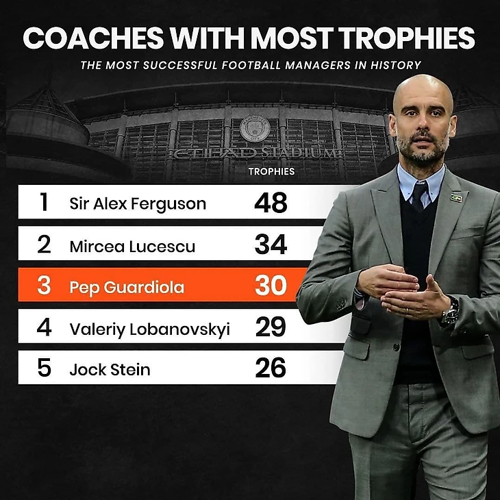 Вчера, Хосеп Гвардиола выиграл очередной Кубок английской лиги. Этот трофей стал 30-м для каталонца, который позволим ему обойди легендарного коуча Валерия Лобановского.