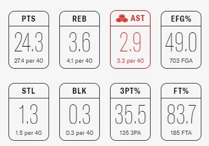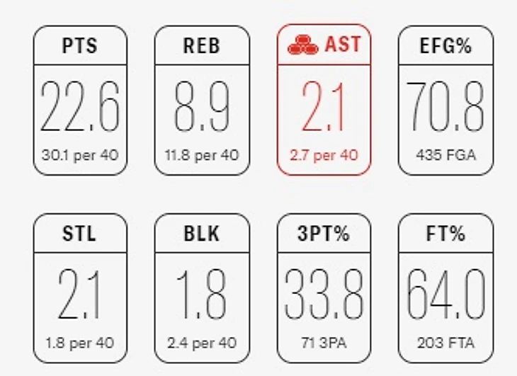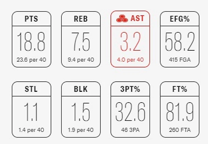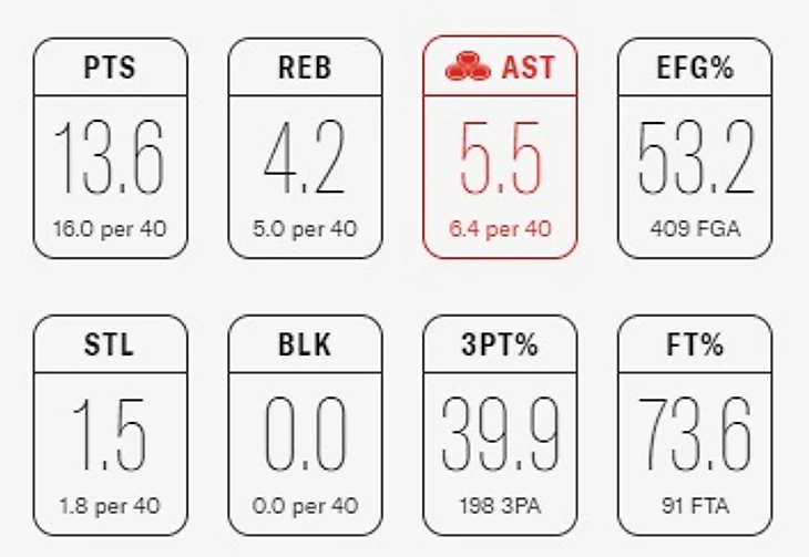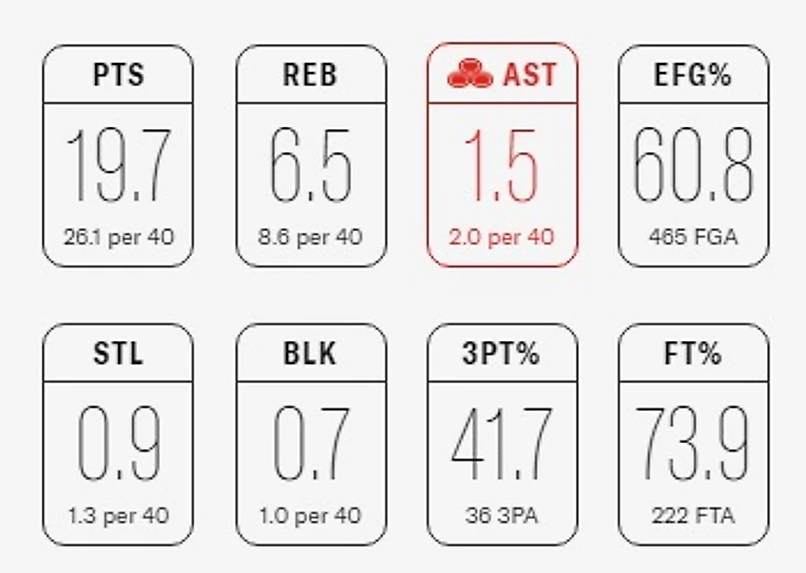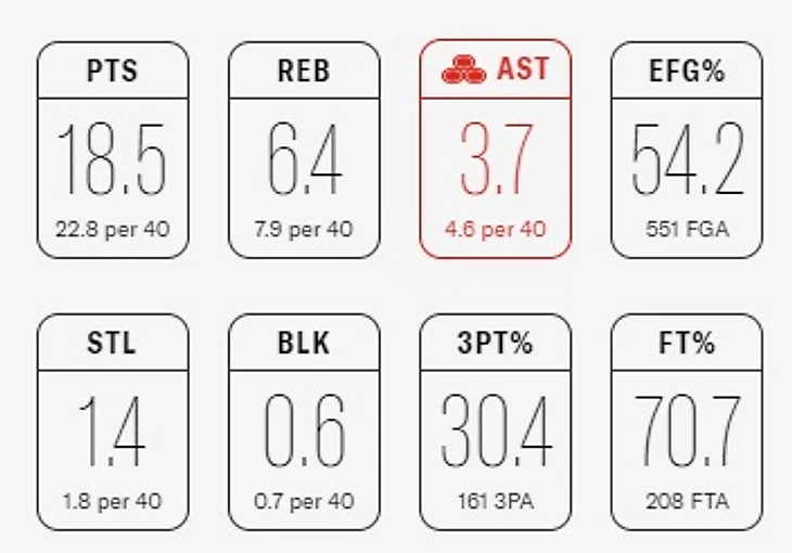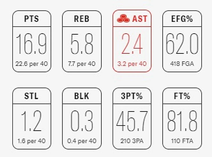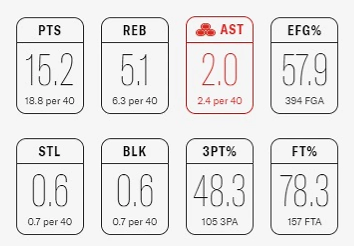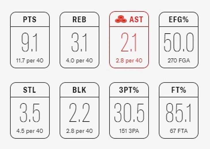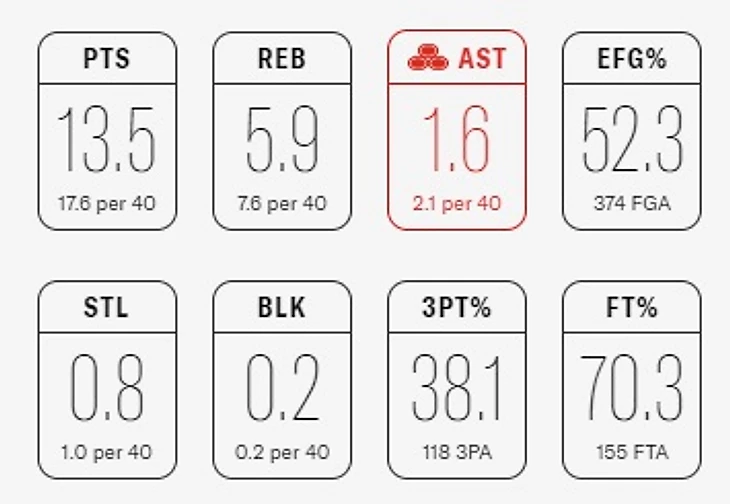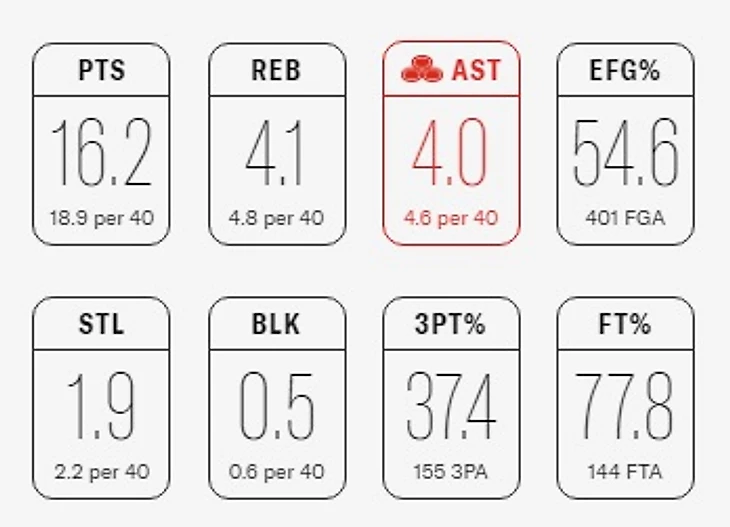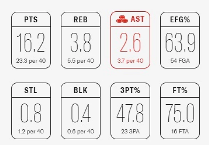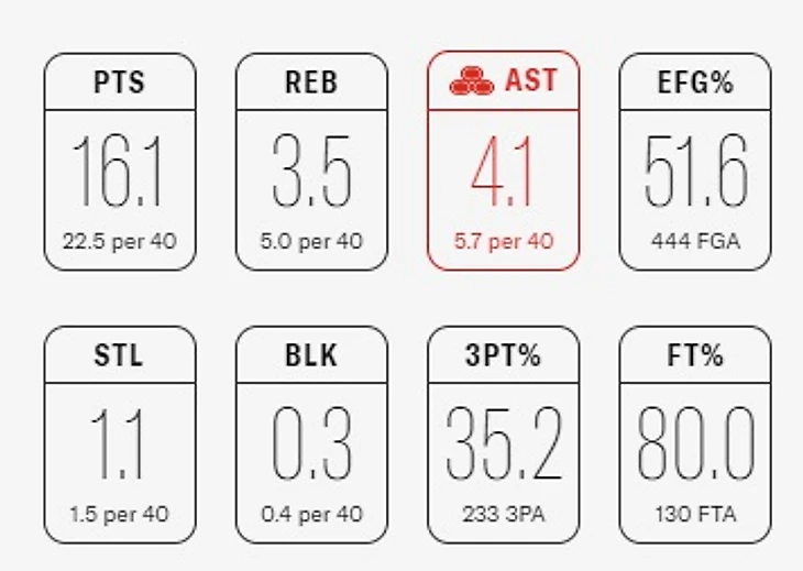 ·         Бескорыстный распасовщик, неплохо действует в рамках атакующих схем. Неплохо показал себя в розыгрыше пик-н-ролла.