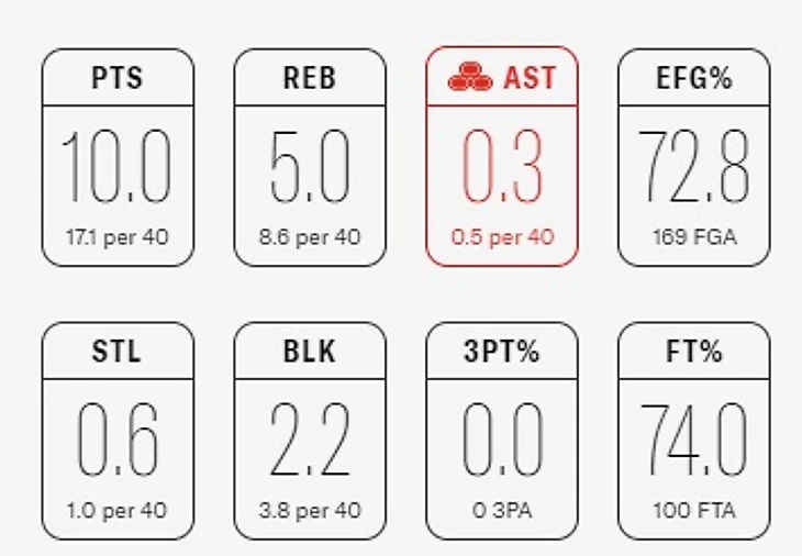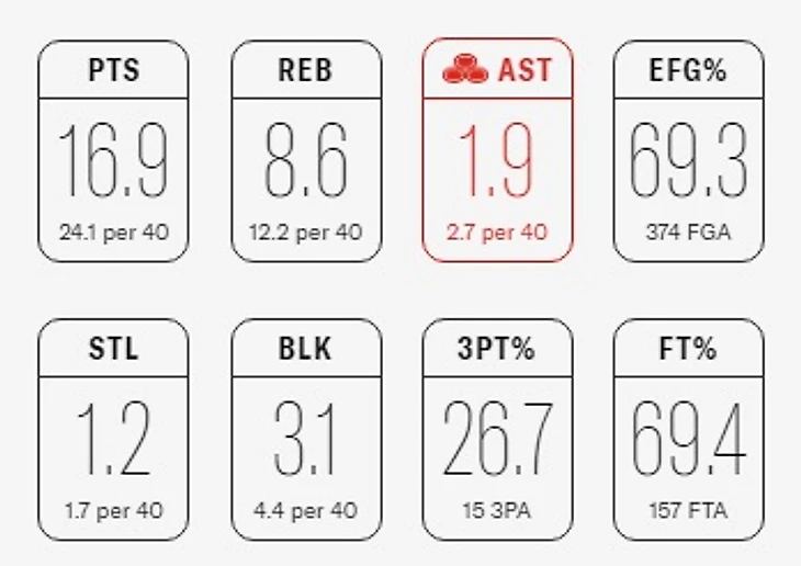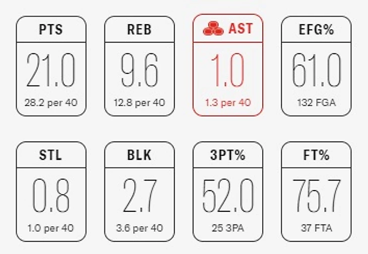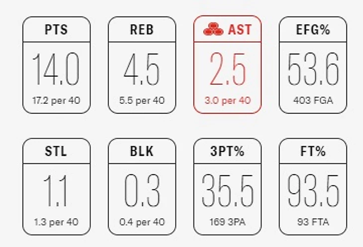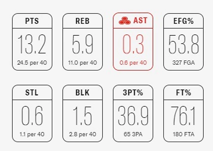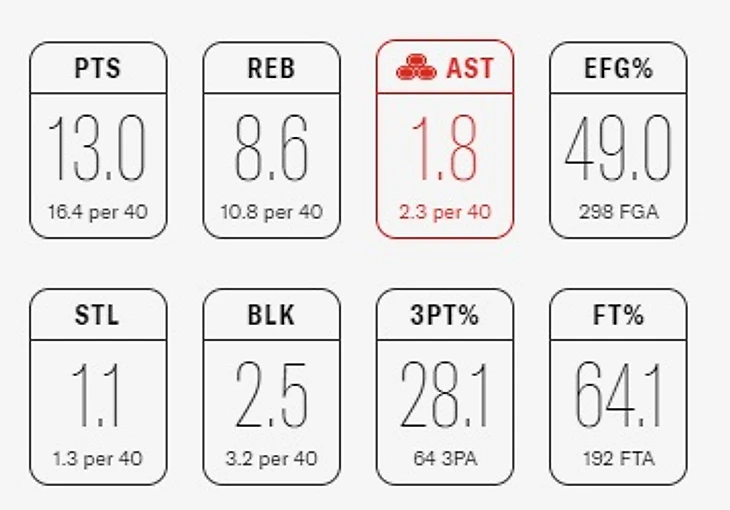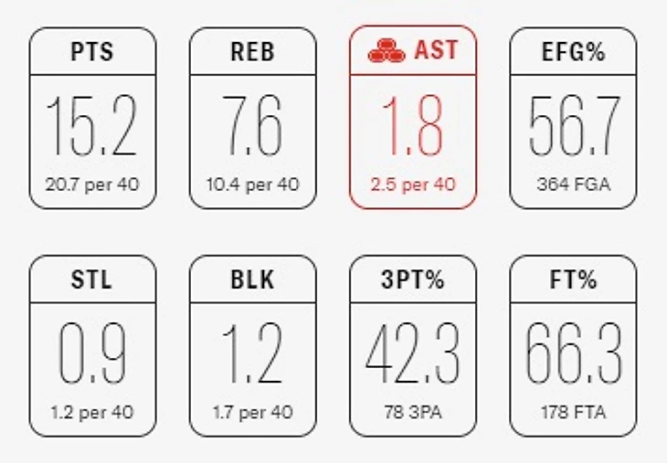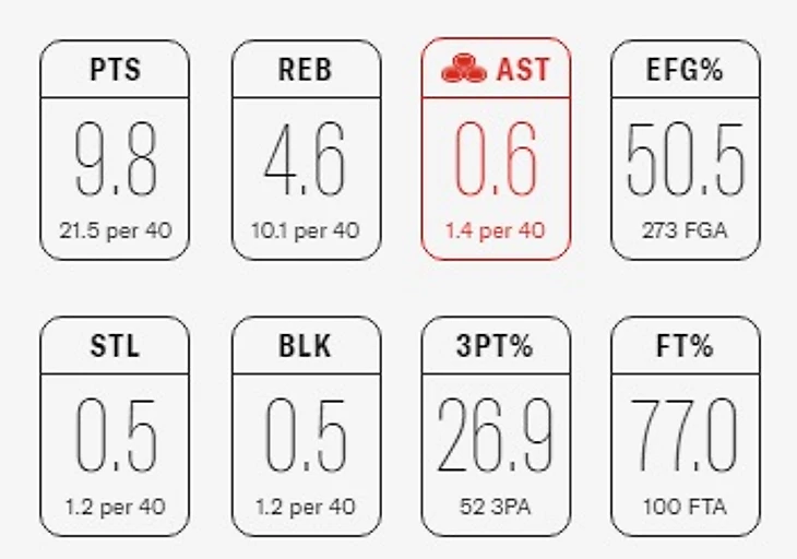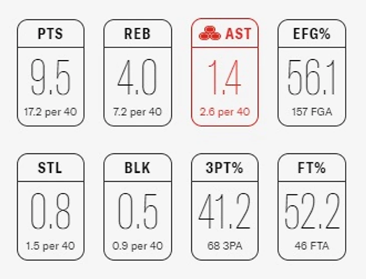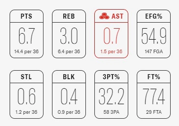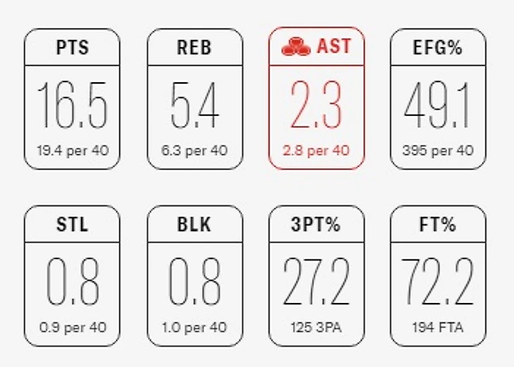 ·         Показал потенциал в бросках после заслонов, но его низкий процент попадания штрафных и не очень мягкая рука при флоатерах вызывают опасения.