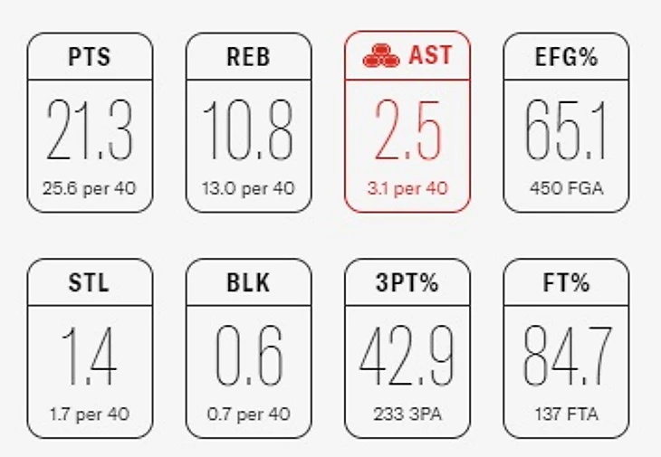 ·         Не всегда чувствует игру; часто задумывается и тормозит нападение, хоть и показывал значительный прогресс по данному компоненту в каждом сезоне.