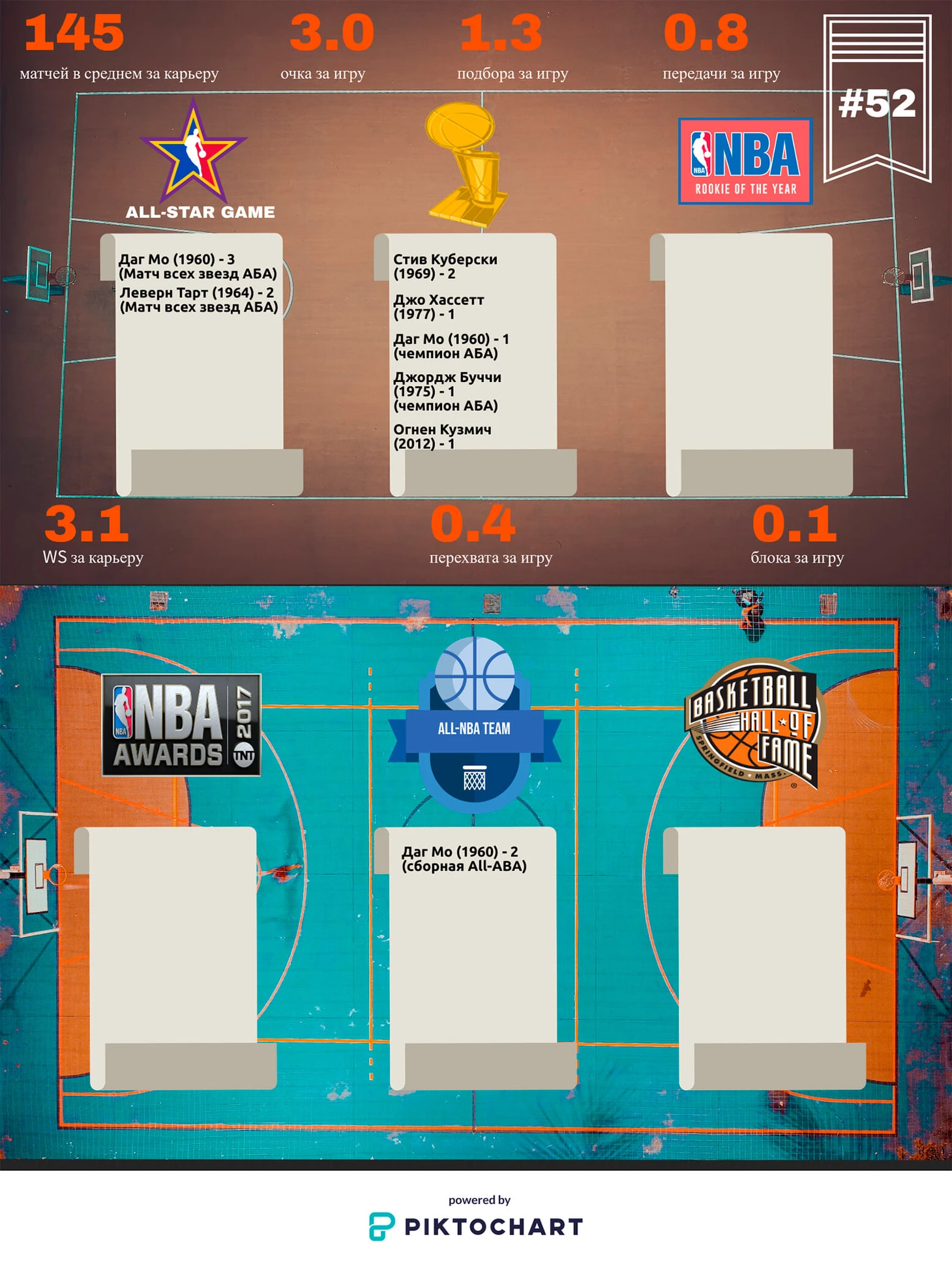 Стив Куберски попал в данную рубрику исключительно благодаря цифровому превосходству – чемпионств у него набралось ровно два. Набирая более чем посредственную статистику (5.5 очков за игру, 3.8 подборов за игру, 0.6 передач за игру), он, тем не менее, был весьма полезным винтиком в адской машине Рэда Ауэрбаха. Более того, во время своего второго прихода в «Селтикс» Куберски даже какое-то время играл в стартовом составе. Я думаю, многие бы хотели оказаться вот так вот на паркете с Джоном Гавличеком и Доном Нельсоном хоть по 10 минут за матч, чтобы завоевать под руководством Рэда заветные перстни. Ну и как финал данной истории – майка с игровым номером, под которым играл Куберски, оказалась под сводами «Гардена». Шутка, скажете вы? Вовсе нет. Просто Стив – последний из кельтов, кто носил номер #33 до Ларри Берда.