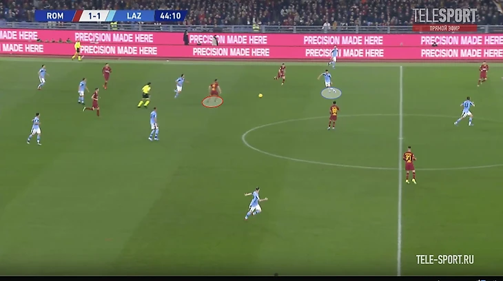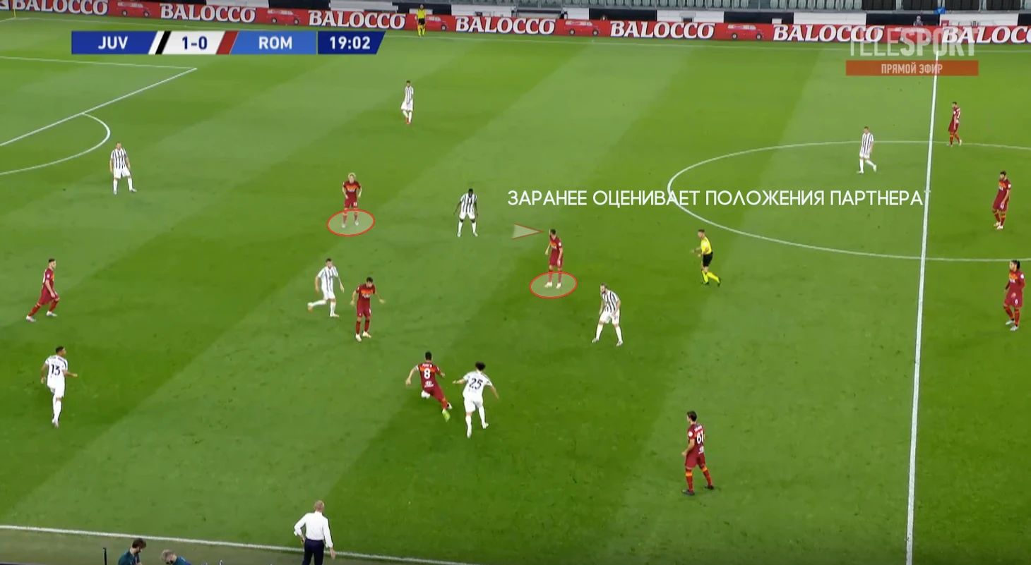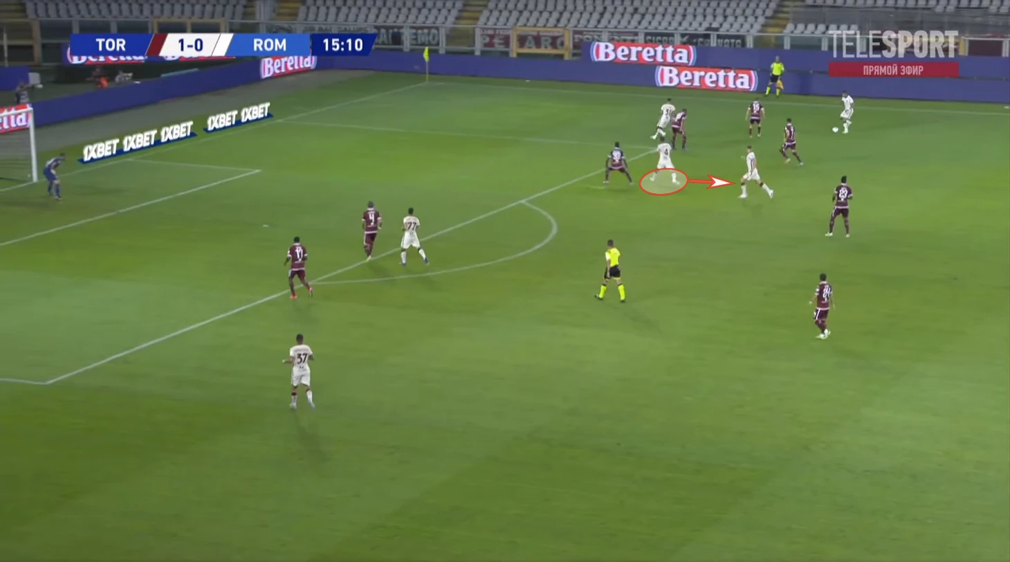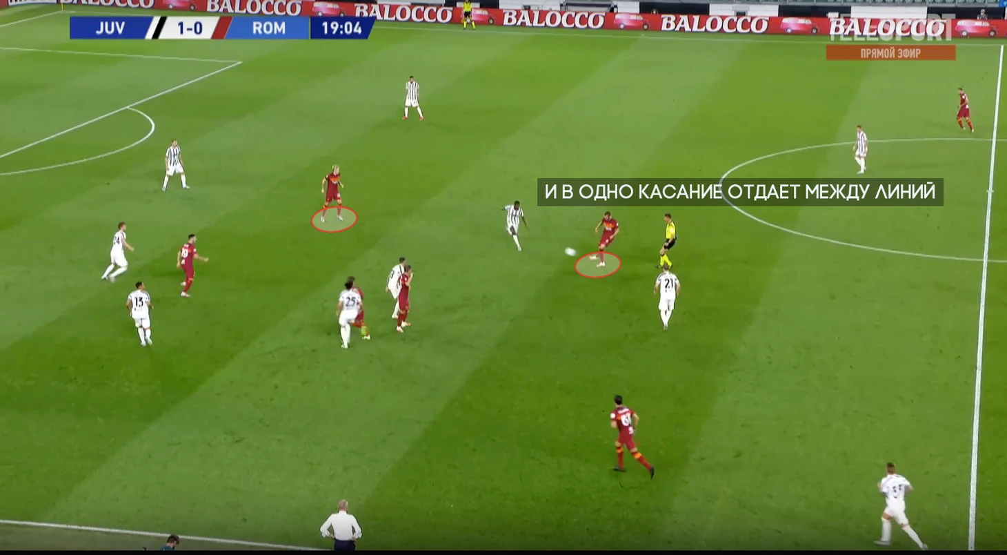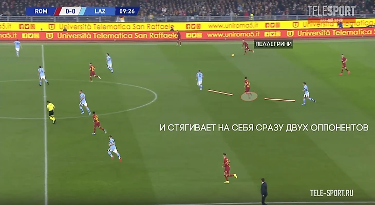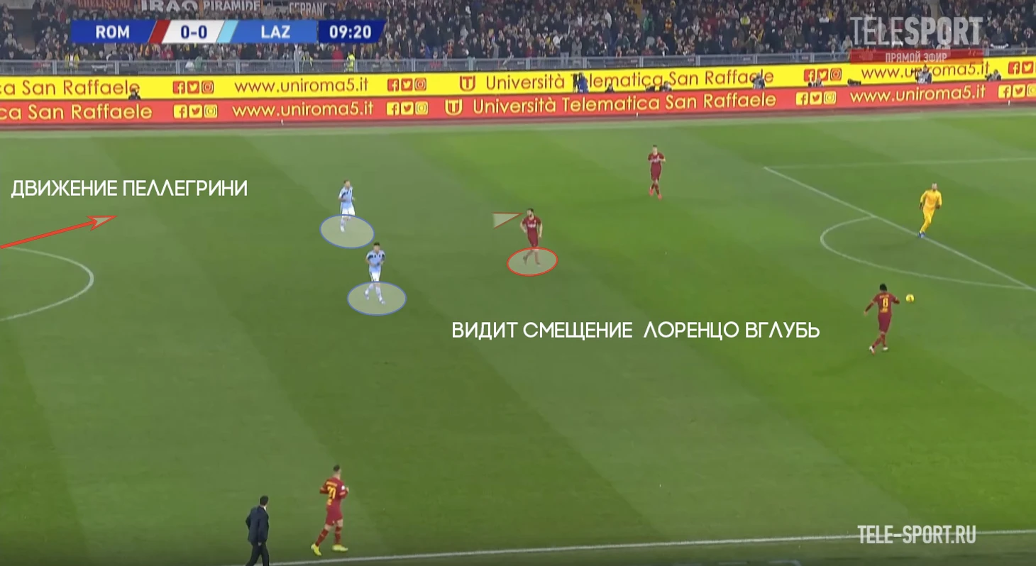 На позицию Пеллегрини поднимается второй опорник, а Кристанте продолжает движение и подстраивается под партнеров уже в развитии.
