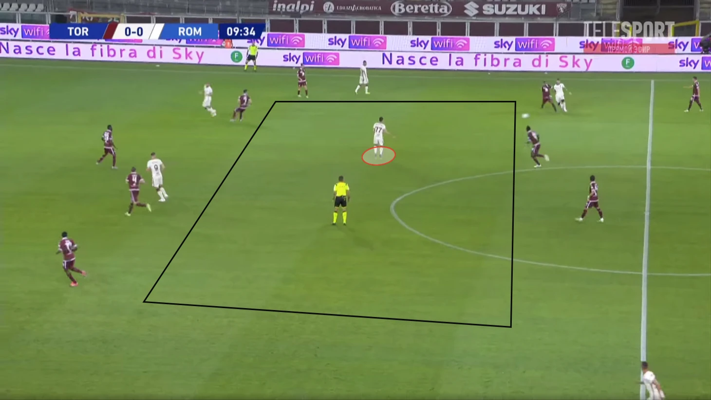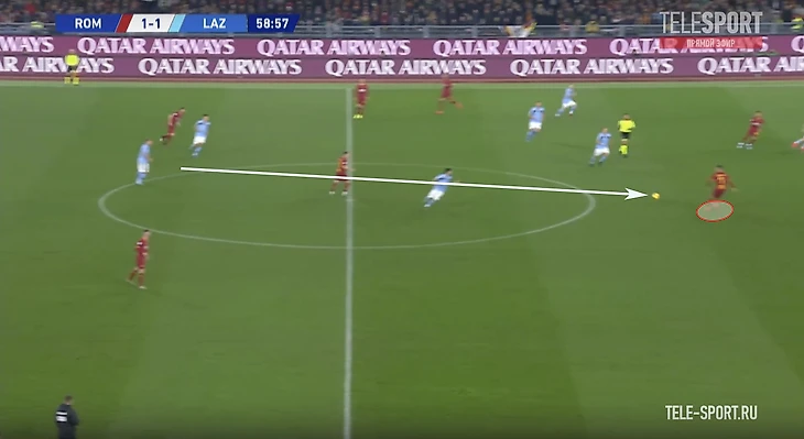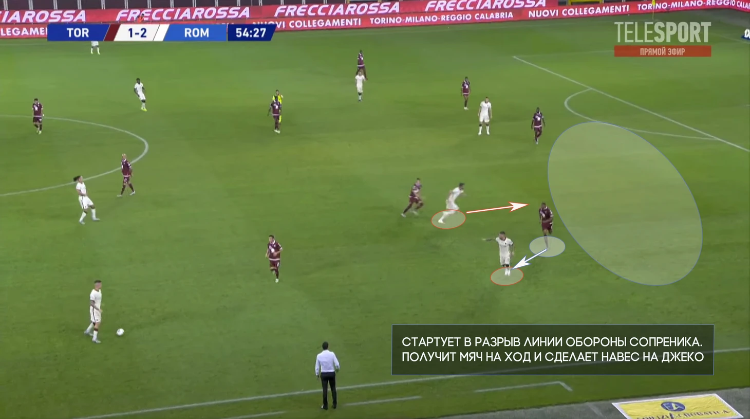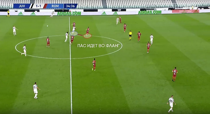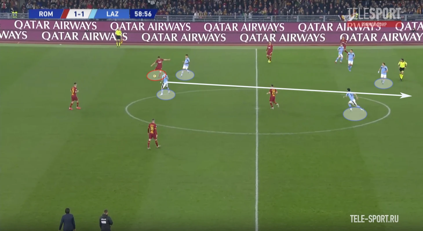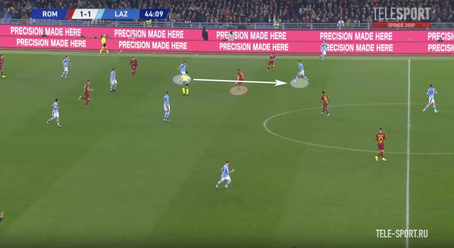 На позицию Пеллегрини поднимается второй опорник, а Кристанте продолжает движение и подстраивается под партнеров уже в развитии.