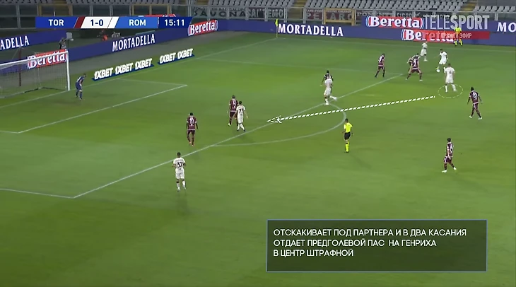 Оценивает ситуацию вокруг и в одно касание отдает на Дзаньоло.